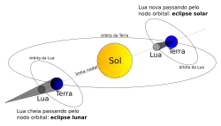 O eclipse ocorre quando a Lua cheia coincide com a passagem da Lua pelo plano da órbita da Terra. Este ponto onde a órbita da Lua se encontra com o plano da órbita da Terra chama-se nodo orbital.[6] O nodo pode ser classificado como ascendente ou descendente, de acordo com a direção que a Lua cruza o plano.