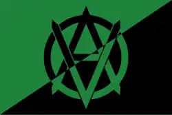 - ↑ Veganarchy symbol; popularised by Brian A. Dominick's 'Animal Liberation and Social Revolution' pamphlet in 1995. The front cover combined the 'V' from vegan with the anarchist 'A' symbol from anarchism