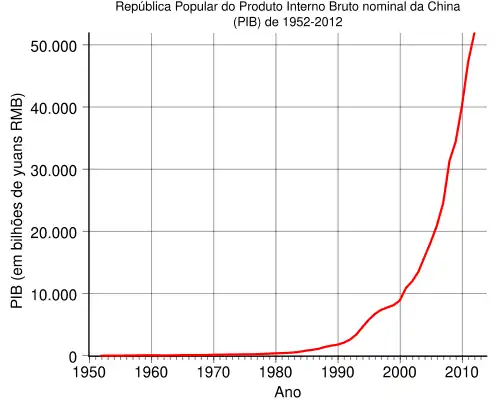 A China é a nação com o maior crescimento econômico dos últimos 25 anos no mundo, com a média do crescimento do PIB em torno de 6% por ano.[12] A renda per capita da China tem crescido cerca de 6% ao ano em média nos últimos 30 anos e mais 15 em média aos 25 anos de exportação, que reduziu drasticamente a pobreza no país, mas este rápido crescimento trouxe grandes desigualdades na distribuição de renda.[13] A renda per capita do país está classificada como mediana a baixa, se comparada com os padrões mundiais, e está em cerca de 3.100 dólares por pessoa (nominal, 104.º numa lista de 178 países/economias), Fundo Monetário Internacional (FMI).