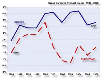 O crescimento do PIB da Grécia foi, na média, superior ao crescimento médio da UE, desde o início dos anos 1990. Entretanto, a economia grega enfrenta problemas importantes, incluindo o aumento do nível de desemprego, a ineficiência burocrática, evasão fiscal e corrupção.[17][18]