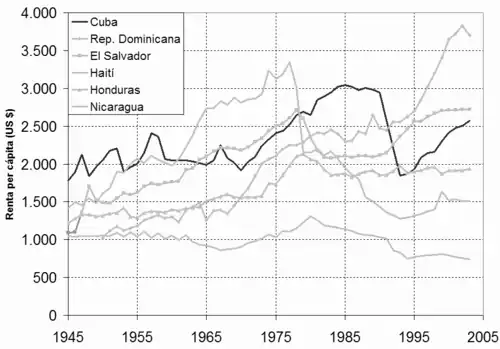 Historicamente, Cuba foi um dos países mais prósperos da América Latina.[9] No momento da Revolução Cubana, de 1953 a 1959, durante a ditadura militar de Fulgencio Batista, o PIB per capita de Cuba ficava em 7º lugar entre 47 economias latino-americanas. A revolução socialista foi seguida pelo atual embargo dos Estados Unidos contra Cuba, descrito como "o mais antigo e abrangente regime de sanções econômicas dos Estados Unidos contra qualquer país do mundo".[10]
