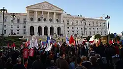Em 6 de abril de 2011, o então primeiro-ministro José Sócrates anunciou na televisão nacional que o país pediu ajuda financeira ao Fundo Monetário Internacional (FMI) e ao Fundo Europeu de Estabilidade Financeira, como a Grécia e a República da Irlanda já haviam feito. Foi a terceira vez que a ajuda financeira externa foi solicitada ao FMI — a primeira foi no final de da década de 1970, após a Revolução dos Cravos.[35] Em 6 de julho do mesmo ano, a agência de notação norte-americana Moody's coloca Portugal na avaliação "lixo financeiro", provocando a queda dos maiores bancos nacionais no PSI, iniciando uma onda de revolta em Portugal e na Europa, existindo propostas para criação de uma agência de notação financeira, de modo a acabar com a hegemonia americana.[36]