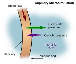 A formação de fluído intersticial é regulada pelas forças da Equação de Starling.[7] A pressão hidrostática dentro dos vasos sanguíneos tendem a expulsar a água para os tecidos, levando a uma diferença nas concentrações de proteínas entre o plasma sanguíneo e eles. Como resultado, a pressão coloidal, ou pressão oncótica - gerada principalmente pela albumina (responsável por 80% da pressão oncótica exercida pelo plasma) e globulina, proteínas que exercem significativa pressão osmótica devido à sua capacidade de se ligar a muitos íons, como Ca++, Na+ e K+ - no plasma tendem a retirar a água dos tecidos para os vasos sanguíneos novamente. A equação de Starling mostra que a taxa de vazão de um fluído é determinada pela diferença entre as duas forças e pela permeabilidade da parede do vaso à água, que determina a taxa do fluxo relativa ao desbalanceamento de certa força. A maior parte desse vazamento ocorre nos capilares ou vênulas pós-capilares, que possuem uma membrana semipermeável que permite que a água atravesse mais facilmente que as proteínas.