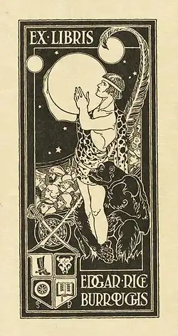 Capa de The Chessmen of Mars, McClurg, 1922, arte de J. Allen St John.Bookplate de Edgar Rice Burroughs mostrando Tarzan segurando o Planeta Marte, cercado por outros personagens símbolos e personagens do autor.Capa de At the Earth's Core (1922), arte de J. Allen St John.