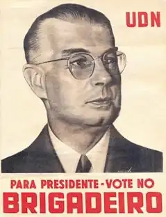 No final do Estado Novo, candidatou-se às eleições presidenciais, marcadas para dezembro de 1945, formando em torno de si a União Democrática Nacional (UDN). Durante o período eleitoral, eram vendidos doces para angariar fundos para apoiar sua campanha; esses doces ficaram conhecidos posteriormente com o nome da patente do candidato: brigadeiros.[7] Foi derrotado pelo general Eurico Gaspar Dutra, ministro da Guerra de Vargas.[5]