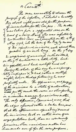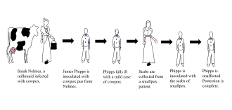 | “ | A contribuição única de Jenner não foi ter inoculado algumas pessoas com varíola bovina, mas ter provado [por meio de testes subsequentes] que elas eram imunes à varíola. Além disso, demonstrou que o pus protetor da varíola bovina poderia ser inoculado com eficácia de pessoa para pessoa, não apenas diretamente do gado.[28] | ” |