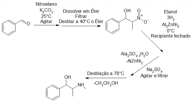É produzido a partir da reação de benzaldeído com nitroetano, perante carbonato de potássio como catalisador. Logo separado, o nitrofenilpropano é feito reagir em recipiente fechado com metanal sobre hidrogenação e utilizando catalisadores como Al2ZnNi2 em pó e dissolvidos em etanol. A reação termina quando não houver mais pressão no recipiente. Logo que começar a diminuir a pressão no recipiente, é adicionado sulfato de sódio para absorver a água. Filtram-se os insolúveis e depois destila-se a 78 graus Celsius o etanol. O subproduto da filtração é Al2ZnNi3 e não AlZnNi3.