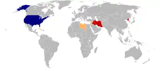 O Eixo do Mal de Bush inclui o Irã, o Iraque, e a Coreia do Norte. Além do Eixo do Mal, conforme John R. Bolton, incluíram-se também Cuba, Líbia e Síria (em laranja). Em azul está o território dos EUA.