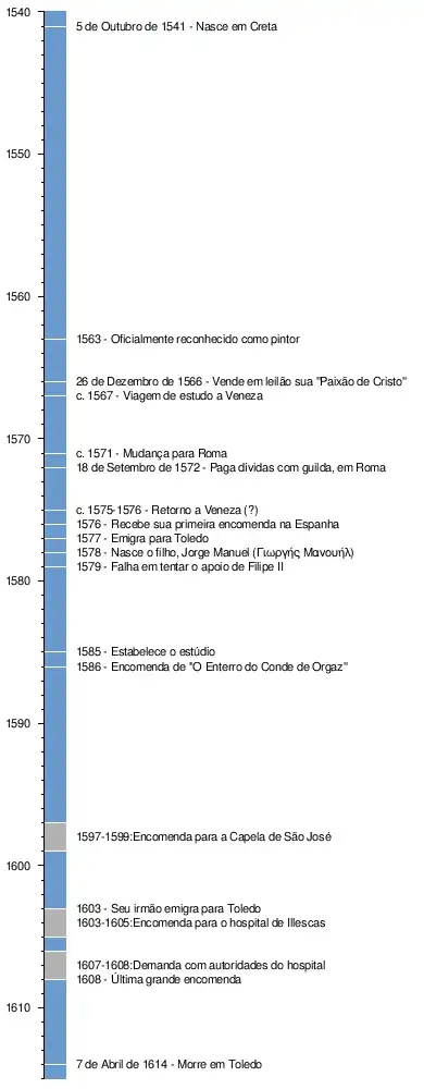 - ↑ De acordo com pesquisas em arquivos feitas nos anos 1990, El Greco encontrava-se em Candia na idade de vinte e seis anos. É desta época alguns de seus trabalhos mais admirados, criados no espírito dos pintores pós-bizantinos da Escola cretense. Em 26 de dezembro de 1566 El Greco buscou permissão das autoridades venezianas para vender um "painel da Paixão de Cristo executado em um "fundo dourado" ("del de Passione Nostro Signor Giesu o Christo, dorato") em leilão[3] O ícone bizantino pelo jovem Doménicos que descreve a Paixão de Cristo, pintado sobre um fundo de ouro, foi avaliado e vendido em 27 de dezembro de 1566 em Candia pelo preço de setenta ducados de ouro (o painel foi avaliado por dois artistas, sendo um deles o renomado pintor de ícones, Georgios Klontzas. Um estimou-lhe em oitenta ducados, e o outro por setenta) - um valor equivalente aos trabalhos deste período feitos por Ticiano ou Tintoretto.[15] Com base nisso, parece que a viagem de El Greco para Veneza deu-se somente após essa data.[16] Em um dos seus últimos artigos, Wethey reavaliou suas estimativas anteriores e admitiu que o pintor deixara Creta em 1567.[17] De acordo com outro materia de arquivo - desenhos de El Greco enviados a um cartógrafo cretense - ele estava em Veneza antes das 1568.[15]