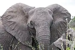 As orelhas de elefante têm bases espessas e pontas mais finas. Os pavilhões auriculares contêm numerosos vasos sanguíneos chamados capilares. O sangue quente flui nos capilares, ajudando a libertar o excesso de calor corporal para o ambiente. Isto ocorre quando os pavilhões estão estendidos e o animal pode melhorar o efeito agitando as orelhas. As superfícies da orelha maiores contêm mais capilares, pelo que podem libertar mais calor. De todos os elefantes, os africanos-da-savana são os que vivem em climas mais quentes, pelo que têm as orelhas maiores.[66] Os elefantes são capazes de ouvir em frequências baixas e são mais sensíveis à frequência de 1 kHz (muito semelhante ao dó de um soprano).[67]