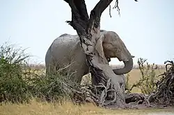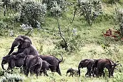 O círculo social das elefantas não termina necessariamente na sua pequena unidade familiar. No caso dos elefantes do Parque Nacional de Amboseli, no Quénia, as elefantas interagem com outras famílias, clãs e subpopulações. As famílias podem associar-se e unir-se entre si, formando o que se conhece como grupos de laços. Geralmente, são compostos por dois grupos familiares,[113] que podem estar estreitamente relacionados devido ao facto de outrora fazerem parte do mesmo grupo familiar que se dividiu por ser demasiado grande para os recursos disponíveis.[117] Durante a estação seca, as famílias de elefantes podem agrupar-se e formar outro nível de organização social conhecido como clã. Os grupos dentro destes clãs não formam laços fortes, mas defendem as suas áreas de temporada seca contra outros clãs. Normalmente, há nove grupos num clã. A população de elefantes de Amboseli divide-se ainda em subpopulações "central" e "periférica".[113]