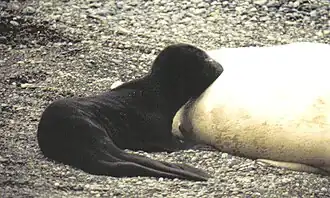 Os filhotes nascem como uma pelagem própria, o lanugo, inteiramente preta, que não é adaptada à água, mas que tem uma densidade suficiente para protegê-los do frio e do meio ambiente. A transformação da voz acompanha o desmame.[7]