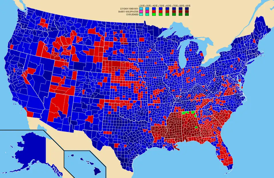 Esta foi a última eleição em que o Partido Democrata conquistou a maioria do voto branco, com 59% dos eleitores brancos votando em Johnson em vez de Goldwater. Foi também a última eleição em que o candidato democrata venceu em Idaho, Utah, Wyoming, Dakota do Norte, Dakota do Sul, Nebraska, Kansas ou Oklahoma, e a única eleição em que os democratas venceram no Alasca. Esta eleição marcou a primeira vez na história em que os democratas venceram em Vermont e, inversamente, a primeira em que os republicanos venceram na Geórgia. Até 2024, esta foi a última vez em que um candidato presidencial democrata recebeu mais de 400 votos eleitorais, além de vencer em 40 ou mais estados.[4]