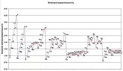 Em química, eletronegatividade (símbolo χ letra grega minúscula) é a medida relativa da força de atração que um átomo (ou um grupo funcional) exerce sobre o par de elétrons envolvidos em uma ligação química, normalmente covalente.[1]