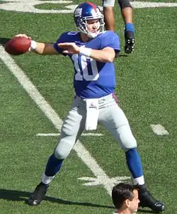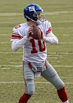 Eli Manning foi titular em 210 jogos consecutivos de 2004 a 2017, a segunda maior sequência por um quarterback na história da NFL. Quando se aposentou, em 2020, era o sétimo ma história da liga em jardas passadas e touchdowns lançados na carreira.[3] Apesar da falta de consistência e comparativamente um desempenho a baixo do calibre de seu irmão Peyton, Eli ficou mais conhecido por suas duas improváveis vitórias no Super Bowl em 2007 e 2011, nas quais ele liderou duas vitórias do Giants contra os Patriots.[4]