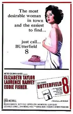 Em 1959, ela devia mais um filme para a MGM, que decidiu que deveria ser "Disque BUtterfield 8" (1960), um drama sobre uma prostituta da alta classe, em uma adaptação do romance de mesmo nome, escrito por John O'Hara e lançado em 1935.[3]:211–223 O estúdio calculou corretamente que a imagem pública da atriz tornaria mais fácil para o público associá-la ao papel.[3]:211–223 Ela odiou o filme pela mesma razão, mas não teve escolha, embora o estúdio tenha concordado com suas exigências de filmar em Nova Iorque e escalar Eddie Fisher para um papel simpático.[3]:211–223 Como previsto, "BUtterfield 8" foi um grande sucesso comercial, arrecadando US$ 18 milhões mundialmente.[3]:224–236 Crowther escreveu que Taylor "parece um milhão de dólares, em vison ou em negligée",[36] enquanto Variety afirmou que ela dá "um retrato tórrido e pungente com uma ou duas passagens brilhantemente executadas".[37] Taylor ganhou seu primeiro Oscar de melhor atriz por sua atuação.[3]:224–236