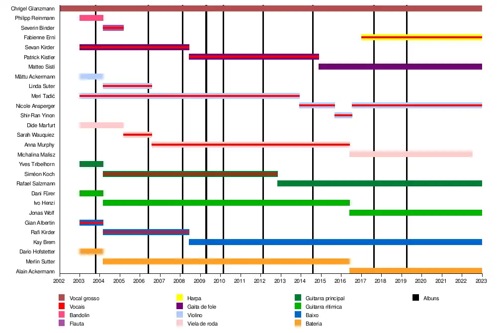 - Chrigel Glanzmann - vocal grosso, bandolim, flauta, gaita, apito, bodhrán (espécie de tambor tribal) (2002-presente)