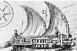 Uma jangada à vela do século 17 no porto de Paita (Peru).[2]