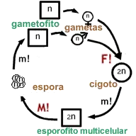 Visto neste contexto, os grupos de briófitas sensu lato (especialmente os musgos) e as plantas vasculares parecem ter explorado dois mecanismos diferentes para aumentar o número de esporos produzidos pelo evento de fertilização.[23] Nos musgos, este aumento na produção de esporos foi alcançado pela intercalação de um estado de protonema filamentoso que pode produzir inúmeros gametófitos foliares não ramificados, cada um carregando um único esporófito não ramificado terminado num único esporângio. Em contraste, na linhagem de plantas vasculares, o número de esporângios foi aumentado pela ramificação do esporófito, de modo que cada extremo de cada ramo pudesse suportar um esporângio.
