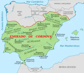 As disputas no Levante ocasionam, em 750, a queda do Califado Omíada. A nova dinastia reinante, os Abássidas, decretam a morte de todos os membros da família omíada. Entretanto, seis anos depois, Abderramão I desembarcou em Al-Andaluz e proclamou-se emir depois de conquistar Córdova.[1] A unificação política peninsular, entretanto, aconteceu apenas em 781, depois de capturar Saragoça e Pamplona.