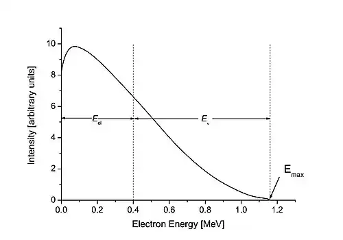 A presença do neutrino torna o processo um decaimento de três corpos, de modo que a energia disponível é distribuída continuamente entre o elétron e o antineutrino. Dessa forma, o espectro de energia cinética do elétron apresenta um caráter contínuo.
