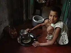 Essas crianças são muito vulneráveis à exploração. Com frequência, elas não têm permissão para fazer pausas ou são obrigadas a trabalhar muitas horas. Além disso, muitas sofrem com a falta de acesso à educação, o que pode contribuir para o isolamento social e a falta de oportunidades futuras. A UNICEF considera o trabalho doméstico uma das categorias que menor prestígio social e relata que a maioria das crianças trabalhadoras domésticas vivem na casa dos empregadores e estão sob seu controle 24 horas por dia.[45] O trabalho doméstico infantil é comum em países como Bangladesh e Paquistão.[46][47] No Paquistão, de janeiro de 2010 a dezembro de 2013, foram registrados 52 casos de tortura de crianças trabalhadoras domésticas, incluindo 24 mortes.[48] Estima-se que, globalmente, pelo menos 10 milhões de crianças trabalham em empregos domésticos.[47]