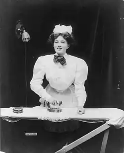 Uma empregada doméstica passando uma toalha de renda com o ferro elétrico GE, circa 1908