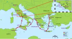 Após sair de Troia, Eneias reuniu outros sobreviventes e construiu vinte navios. Inicialmente, aportou na Trácia, esperando encontrar refúgio junto do rei local Polimnestor. Este era genro do último rei troiano, Príamo. Para ele, os troianos tinham enviado o príncipe Polidoro com ouro. Quando o rei trácio soube da queda de Troia, ordenou a morte de Polidoro e ficou com o ouro. Ao saber da traição de Polidoro, Eneias abandonou a Trácia e seguiu caminho[22].