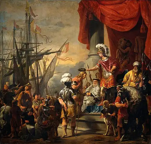 A figura de Eneias exerceu uma influência profunda na literatura portuguesa, servindo de modelo estrutural para a obra máxima da língua: Os Lusíadas de Luís de Camões.[69] Camões mimetiza a estrutura da Eneida para narrar a viagem de Vasco da Gama, estabelecendo um paralelo entre a fundação de Roma e a expansão do império luso, onde o herói português assume o papel de um "novo Eneias" guiado pela providência.[70]