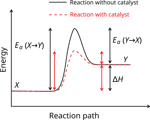 O estado de transição ao longo de uma reação normal é o ponto de máxima energia livre. O estado de transição existe somente por um período extremamente breve de tempo (10−15 s). A energia necessária para alcançar o estado de transição é igual a energia de ativação da reação. Reações de multi-estágio envolvem inúmeros pontos de transição, onde a energia de ativação é igual a maior energia requerida. Depois deste período as moléculas ou se separam novamente refazendo suas ligações originais, ou as ligações são quebradas e novos produtos são formados. Isto é possível porque ambas as possibilidades resultam na liberação de energia (como mostrado no diagrama de entalpia, Fig-1, ambas as posições são mais baixas que o estado transição). Uma substância que modifica o estado de transição diminuindo a energia de transição é denominada como catalisador; um catalisador biológico é denominado enzima. É importante notar que um catalisador diminui a energia de ativação; isto não muda a energia do produto remanescente e somente a energia de ativação é alterada (diminuída).