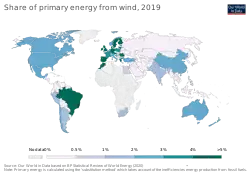 Em alguns países, a energia elétrica gerada a partir do vento representa significativa parcela da demanda. Em 2020, 48% da eletricidade consumida na Dinamarca foi gerada por turbinas eólicas, 25% em Portugal, 22% na Espanha, 38% na Irlanda e 27% na Alemanha.[33] Globalmente, a energia eólica é responsável por cerca de 6%[32] da eletricidade gerada. Desde 2011, 83 países usam energia eólica em escala comercial.[34]