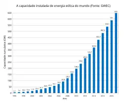 Em 2012 a capacidade mundial de geração de energia elétrica através da energia eólica foi de aproximadamente 282 gigawatts (GW),[29] o suficiente para abastecer as necessidades básicas de dois países como o Brasil(o Brasil gastou em média 70 gigawatts em janeiro de 2010).[30] Para se ter uma ideia da magnitude da expansão desse tipo de energia no mundo, em 2008 a capacidade mundial foi de cerca de 120 GW e, em 2007, 59 GW.[29]