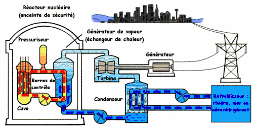 A energia elétrica gerada por uma fonte nuclear é obtida a partir do calor da reação do urânio. A queima[nota 1] do combustível produz calor que ferve a água de uma caldeira transformando-a em vapor. O vapor movimenta uma turbina que dá partida a um gerador elétrico que produz a eletricidade. A animação esquematiza esta sequência:[12]