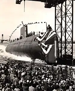Cerimônia de lançamento do USS Nautilus (EUA), primeiro submarino com propulsão nuclear, em 21 de Janeiro de 1954.[4] |