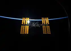 A Estação Espacial Internacional, que obtém sua energia através de painéis fotovoltaicos, fotografada contra a negrura do espaço e a fina linha da atmosfera da Terra.