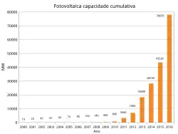 Este tipo de energia usa-se para alimentar uma grande variedade de aplicativos e aparelhos autónomos, para abastecer refúgios ou moradias isoladas da rede elétrica e para produzir eletricidade a grande escala através de redes de distribuição. Devido à crescente demanda de energias renováveis, a fabricação de células solares e instalações fotovoltaicas tem avançado consideravelmente nos últimos anos.[2][3] Entre os anos 2001 e 2015 produziu-se um crescimento exponencial da produção de energia fotovoltaica, dobrando-se aproximadamente a cada dois anos.[4] A potência total fotovoltaica instalada no mundo (conectada à rede) ascendia a 16 GWp em 2008, 40 GWp em 2010, 100 GWp em 2012 e 140 GWp em 2013.[5][6][7][8] No final de 2014, tinham-se instalado em todo mundo cerca de 180 GWp de potência fotovoltaica.[9]