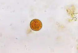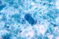 - Esses trofozoítos que permanecem no intestino sob a forma comensal, reduzem o seu metabolismo, armazenam reservas energéticas e secretam uma parede cística ao seu redor, formando os cistos, que são eliminados através das fezes. Dentro do cisto o parasito realiza divisão binária formando quatro novos indivíduos que desencistam quando chegam ao intestino de um novo hospedeiro. Os cistos podem permanecer viáveis fora do hospedeiro por cerca de 20 dias caso as condições de temperatura e umidade sejam adequadas, logo eles são as formas de resistência do parasito no meio ambiente. Os trofozoítos, entretanto, são lábeis no ambiente. De acordo com sua morfologia, apresentam 4 fases: trofozoíto (ou forma vegetativa), cisto (ou forma de resistência), pré-cisto (forma entre trofozoíto e cisto) e metacisto (forma que dá origem ao trofozoíto).