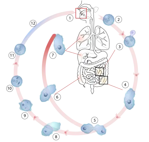 - Seu ciclo evolutivo é monoxênico, ou seja, a Entamoeba histolytica completa seu intervalo em apenas um hospedeiro. O ciclo de vida deste parasito inicia-se com sua ingestão pelo ser humano (via fecal-oral) na forma de cisto (presente em água ou alimentos contaminados), pois nesta forma o parasito apresenta parede cística, capaz de resistir ao ph ácido do suco gástrico. Resistido ao suco gástrico, o cisto diferencia-se na forma de trofozoíto na porção final do intestino delgado e passa a viver como comensal, alimentando-se de bactérias ou restos celulares. Este comportamento é denominado não patogênico.