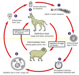 O parasita adulto (hermafrodita) vive durante cerca de um ano no intestino do hóspede definitivo. Os ovos são ingeridos na água ou plantas pelo hospedeiro definitivo, canídeos, ou por hospedeiros intermediários, como ovelhas, roedores ou humanos. No intestino destes animais, os ovos libertam as larvas, que penetram na mucosa do intestino e depois nas veias, migrando pelo sangue até órgãos bem irrigados, principalmente o fígado (que recebe o sangue vindo dos intestinos primeiro), mas também no pulmão ou outros órgãos, ou seja, estes cistos têm membranas múltiplas externas e crescem até se transformarem em cistos hidáticos , os mesmos podem crescer até 15 centímetros de diâmetro, mas frequentemente são maiores, e podem multiplicar-se por fragmentação. Os animais são infectados quando consomem carne contendo estes protoscoceles, que se desenvolvem no seu intestino em formas adultas (similares às tênias) exclusivamente intestinais.