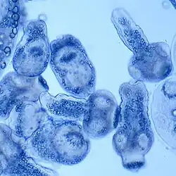 Cisto de ovos de Echinococcus com larvas saindo dos ovos.