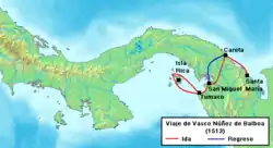 Em 1513, a cerca de 40 quilómetros a sul de Acandí, na actual Colômbia, o espanhol Vasco Núñez de Balboa ouviu dos caciques a notícia inesperada de que existiria um "outro" mar rico em ouro, que recebeu com grande interesse. Com poucos recursos e utilizando a informação dos caciques, atravessou o istmo do Panamá[46] com 190 espanhóis, alguns guias nativos e uma matilha de cães. Usando um bergantim e dez pequenas canoas nativas, navegou ao longo da costa até aportar. A 6 de Setembro a expedição foi reforçada com 1 000 homens, travou diversas batalhas, entrou numa densa selva e subiu a serra ao longo do rio Chucunaque de onde esse "outro" mar podia ser visto. Balboa avançou e, na manhã de 25 de setembro, avistou no horizonte um mar desconhecido, tornando-se o primeiro europeu a ter visto ou alcançado o oceano Pacífico a partir do Novo Mundo. A expedição desceu em direção à praia para uma curta viagem de reconhecimento. Depois de viajar mais de 110 km, Balboa chamou a baía onde chegaram de baía de San Miguel. Nomeou o novo mar "Mar do Sul", pois havia viajado para sul para alcançá-lo. O principal objectivo da expedição fora a busca de ouro e riquezas. Com este fim, cruzou as terras dos caciques até às ilhas, nomeando a maior ilha Rica (hoje conhecida como Ilha do Rei) e o arquipélago ilhas Pérola, nome que conserva até hoje. Em 1515-1516, Juan Díaz de Solís navegou até ao Río de la Plata, que nomeou, morrendo na tentativa de encontrar uma passagem na América do Sul para o "mar do Sul" ao serviço de Espanha.