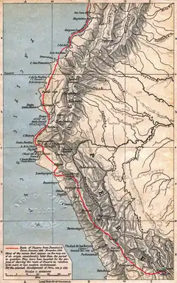 Desembarcaram perto do Equador e após lutar com os Punian, navegaram para Tumbes, encontrando o local destruído. Avançaram no interior onde estabeleceram o primeiro assentamento espanhol no Peru, San Miguel de Piura. Um dos homens voltou com um enviado Inca e um convite para um encontro. Os Incas estavam em guerra civil e Atahualpa descansava no norte do Peru perto de Cajamarca, após derrotar o seu irmão Huascar. Caminharam dois meses até Atahualpa. Este, porém, recusou a presença espanhola, dizendo que não "seria tributário de ninguém." Havia menos de 200 espanhóis a 80 000 soldados incas, mas Pizarro atacou o exército inca na Batalha de Cajamarca. Os espanhóis foram vitoriosos e prenderam Atahualpa na chamada sala de resgate. Apesar de cumprir sua promessa de encher uma sala com ouro e duas de prata, foi condenado pelo assassinato de seu irmão e conspirar contra Pizarro, e foi executado.