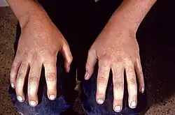 O eritema infeccioso, também conhecido como quinta doença, é uma doença infecciosa causada pelo parvovírus B19 e transmitido pela respiração, tosse, espirro e secreções infectadas.[1] É mais comum nas crianças, podendo ocorrer também em adultos. A principal característica é uma erupção cutânea que começa nas bochechas e se espalha pelos membros inferiores e pelo tronco. Em alguns casos a erupção é muito leve, quase imperceptível. Sinais como a febre são mais raros que a erupção acompanhada de dor de cabeça, dor de garganta e coceira. A maioria dos casos curam sozinhos após cerca de uma semana. Somente 10% das mulheres grávidas que contraem a doença apresentam complicações com o feto. Durante o período de incubação do vírus, normalmente 14 dias, a pessoa infectada pode disseminar o vírus para outras não causando qualquer sintoma até o aparecimento da vermelhidão nas bochechas. Após o aparecimento da erupção, não há mais risco de contágio. Não há vacina e nenhuma terapia relacionadas com a causa.