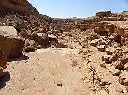 Wadi em árabe ou hebráico como termo para descrever um vale, em Makhtesh Ramon, Israel, mostrando erosão através do colapso da gravidade em seus bancos.