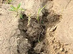 A erosão de desembarque ou voçorocas ocorre quando o escoamento da água se acumula e cai rapidamente em canais estreitos durante ou imediatamente após chuvas intensas ou neve derretida, removendo o solo para uma profundidade considerável.[19][20][21]