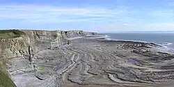 Plataforma de corte de onda causada pela erosão de penhascos pelo mar, em Southerndown, no sul do País de Gales