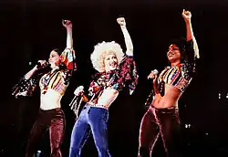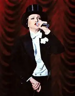 A promoção de Erotica continuou com a The Girlie Show World Tour, que visitou as Américas, Ásia, Europa e Oceania.[100] Segundo alguns críticos, foi a forma da cantora "reviver" sua carreira após a reação negativa ao seu livro e filme.[100] A turnê recebeu o nome de uma pintura de Edward Hopper intitulada "Girlie Show".[101] O irmão de Madonna, Christopher Ciccone, foi nomeado diretor da digressão.[102] Foi dividido em quatro diferentes secções temáticas: Dominatrix, Studio 54, Weimar Cabaret, e um encore.[103] Iniciou-se em Londres em 25 de setembro de 1993 e terminou em Tóquio em 19 de dezembro do mesmo ano.[104] O show começava com a cantora vestida como uma dominatrix, cercada por dançarinas de topless, enquanto os momentos mais leves incluíram ela descendo do teto em uma bola de espelhos gigante usando uma peruca afro para cantar "Express Yourself" (1989), além da performance de "Like a Virgin" (1984) em que ela aparecia disfarçada da atriz Marlene Dietrich.[105][106][107]