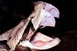 Dentição Solenóglifa/ Solenoglifodonte: há um par de presas tubulares (oco) na posição anterior da boca, sendo as únicas no maxilar. O osso maxilar é muito móvel, permitindo ao dente anterior projetar-se para frente no momento do bote.[23][21]