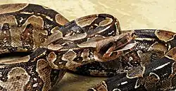 Família Boidae: são serpentes de médio a grande porte, não peçonhentas, que matam suas presas por intermédio da constrição . Sua dentição é áglifa, apresentando hábitos noturnos e modos de vida aquáticos, subarborícolas, terrícolas ou arborícolas. Alimentam-se de vertebrados e algumas de suas espécies apresentam fossetas labiais. Exemplos dessa família são as jibóias (Boa constrictor) e sucuri (Eunectes murinus).[22]