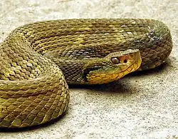 Família Viperidae: são peçonhentas, apresentando dentição solenóglifa e fosseta loreal. Seu tamanho varia de médio a grande. Pode apresentar hábitos terrícolas ou arborícolas, sendo majoritariamente noturnas. Alimentam-se especialmente de vertebrados. Possuem cabeça triangular e recoberta de escamas pequenas. Suas escamas dorsais (do corpo) podem ser carenadas ou quilhadas. São responsáveis por 99% dos acidentes ofídicos no Brasil. Como espécies representantes, pode-se citar a cascavel (Crotalus durissus) e a jararaca (Bothrops jararaca).[22]